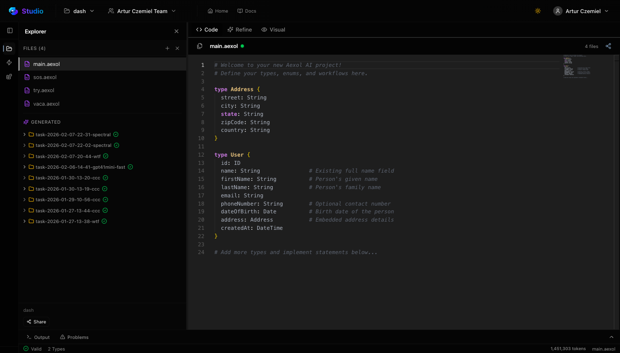 Aexol Studio is a browser-based IDE purpose-built for the Aexol specification language. There's nothing to install — you open it in your browser, sign in, and start building. It combines: