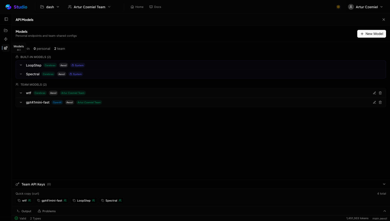 Spectral is Aexol's first composite AI model, and it's specifically designed for the Aexol ecosystem. Unlike general-purpose language models, Spectral combines multiple frontier models — both open and closed weight — into a unified pipeline that's been fine-tuned for Aexol artifact generation.